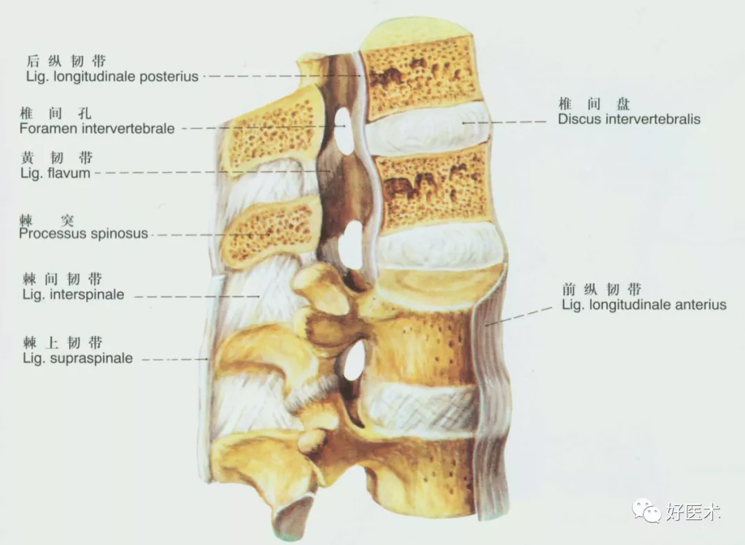 (5)棘间韧带:较薄,连结相邻的两个棘突之间,从棘突根部至其尖部,呈矢状位;后方移行于棘上韧带。在腰部者则宽而厚,呈四方形;胸椎部者则窄而较长;颈椎部者则往往发育不佳。