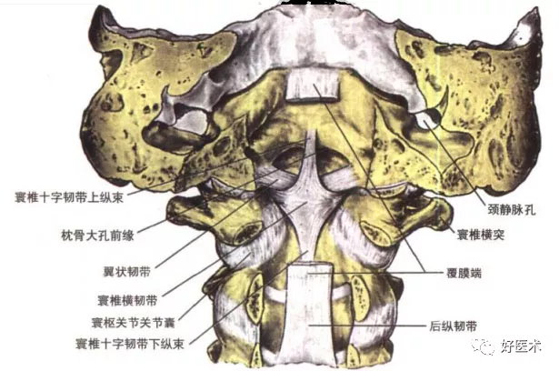 (7)寰枕前膜:其形态比较宽阔,连结枕骨大孔前缘与寰椎前弓上缘之间。韧带的前面中部,因有前纵韧带移行而变厚;其两侧略薄,多与关节囊相愈合。