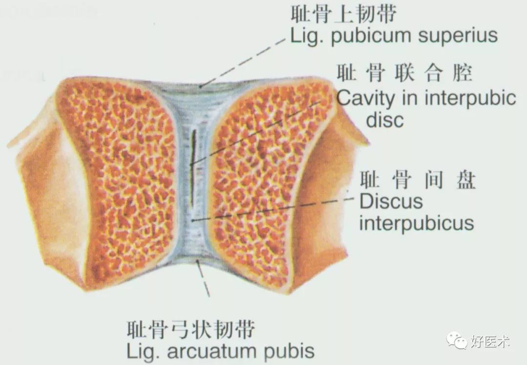 (3)耻骨弓状韧带:较肥厚,呈弓状跨越耻骨联合的下方,连结两侧的耻骨下支之间。上面与耻骨间纤维软骨板愈合;下面游离,与尿生殖隔之间以裂隙相隔,有血管通过。