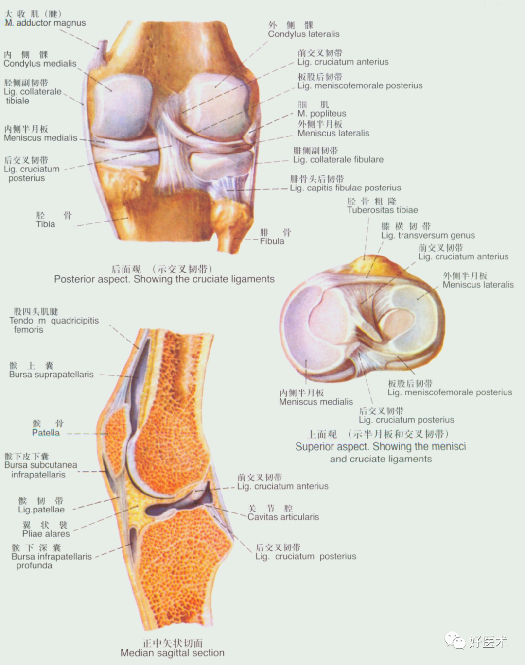 后交叉韧带:居前交叉韧带的后内侧,较前交叉韧带短而强韧。起自胫骨髁间后区与外侧半月板的后端,斜向内上方,止于股骨内侧髁的外侧面。