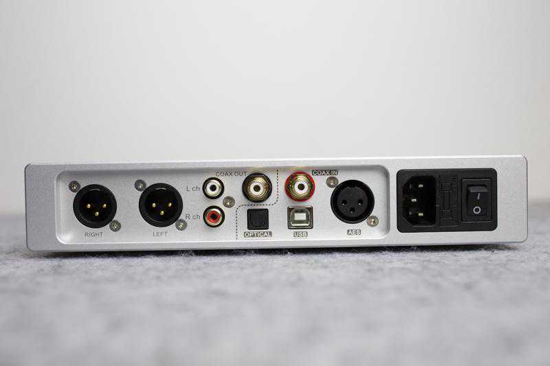 后方接口,从左到右依次是:XLR输出(左右)、RCA输出(左右)、同轴输出(接USB有效)、光纤输入、同轴输入、USB输入、AES输入、电源输入、保险丝、电源开关。