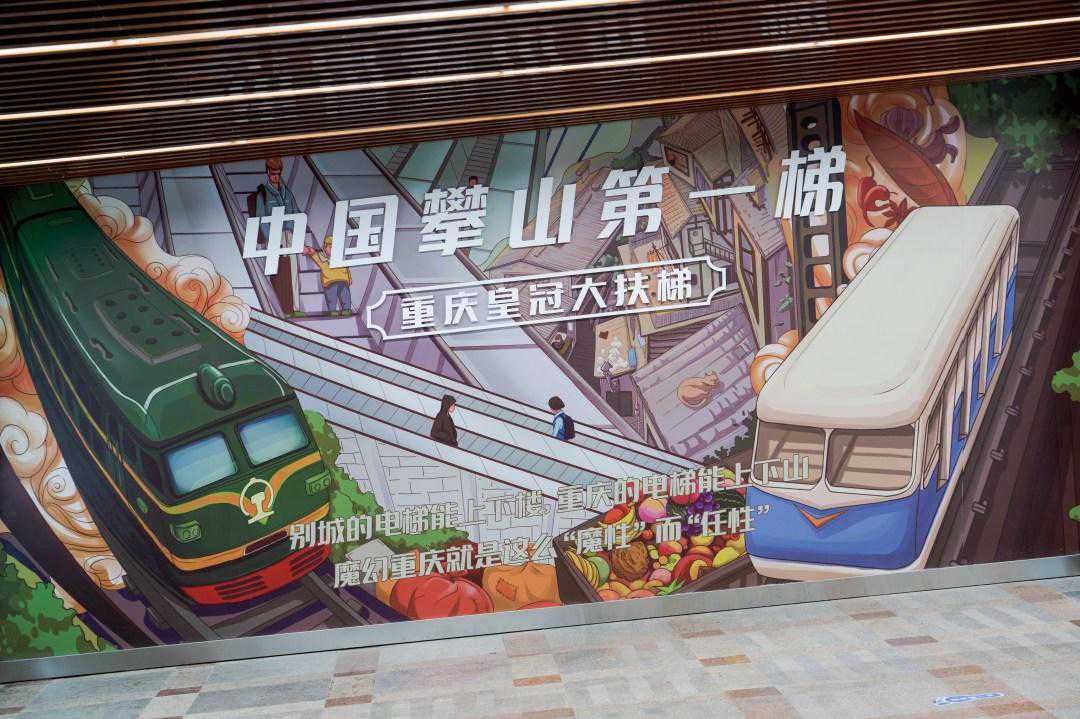 皇冠大扶梯是亚洲第二长的一级提升坡地大扶梯,是山城重庆的一张特色名片,曾有多部影视剧及综艺节目取景于此。