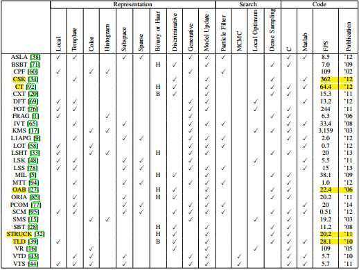 直接上结论:平均来看Struck,SCM,ASLA的性能比较高,排在前三不多提,着重强调CSK,第一次向世人展示了相关滤波的潜力,排第四还362FPS简直逆天了。速度排第二的是经典算法CT(64fps)(与SCM,ASLA等都是那个年代最热的稀疏表示)。如果对更早期的算法感兴趣,推荐另一篇经典的survey(反正我是没兴趣也没看过):