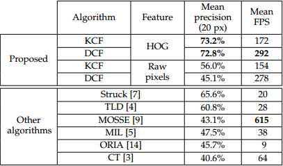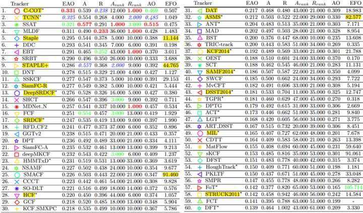 前三名都是相关滤波CF类方法,第三名的KCF已经很熟悉了,这里稍微有点区别就是加了多尺度检测和子像素峰值估计,再加上VOT序列的分辨率比较高(检测更新图像块的分辨率比较高),导致竞赛中的KCF的速度只有24.23(EFO换算66.6FPS)。这里speed是EFO(EquivalentFilterOperations),在VOT2015和VOT2016里面也用这个参数衡量算法速度,这里一次性列出来供参考(MATLAB实现的tracker实际速度要更高一些):