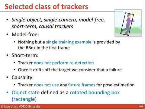 第二部分:背景介绍接下来总体介绍下目标跟踪。这里说的目标跟踪,是通用单目标跟踪,第一帧给个矩形框,这个框在数据库里面是人工标注的,在实际情况下大多是检测算法的结果,然后需要跟踪算法在后续帧紧跟住这个框,以下是VOT对跟踪算法的要求: