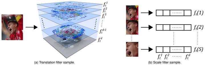 SAMF,浙大YangLi的工作,基于KCF,特征是HOG+CN,多尺度方法是平移滤波器在多尺度缩放的图像块上进行目标检测,取响应最大的那个平移位置及所在尺度: