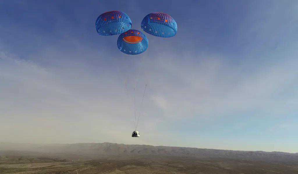 与此同时,由于太空舱腹部表面积较大,再入大气层返回速度较慢。在大约2公里的高度上,它部署了三个减速伞,在大约1公里的高度上部署三个主降落伞。尽管太空舱以每小时25公里的速度降落,但是着陆过程非常缓和,在最后一刻点燃制动推进器,从而在太空舱和地面之间形成一个很好的气垫。这与俄罗斯联盟号载人返回舱着陆时的情况类似。新谢泼德的太空舱实际上可以在两个主降落伞失效时,降落速度缓慢到足以生存。这也要感谢减震座椅,它进一步帮助减轻震动。