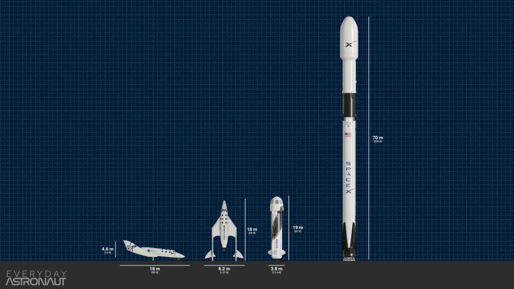 太空船二号长18米,翼展8.2米,尾翼4.6米。蓝色起源的新谢泼德高19m,宽3.8m。作为参考,SpaceX的猎鹰9号高70米,宽3.7米。