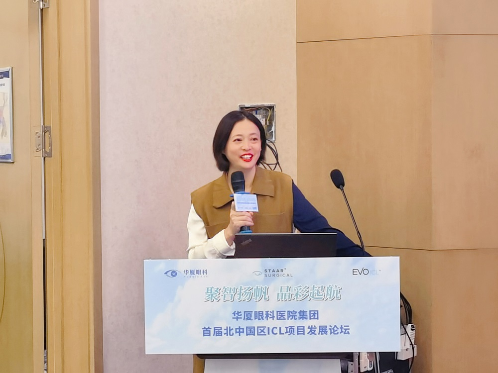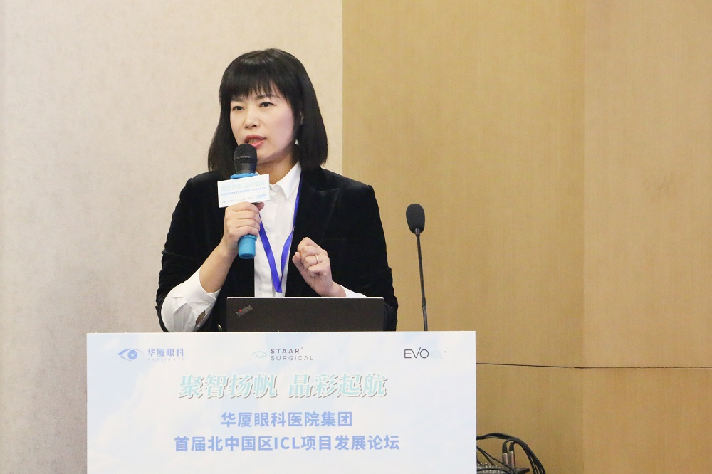 STAAR全国渠道销售总监刘娟现场致辞。她首先祝贺本次论坛顺利召开,对华厦眼科医院集团多年来在EVO-ICL项目领域中的贡献表示感谢。同时她也表示将进一步深入开展与华厦眼科医院集团的战略合作,全方位支持EVO-ICL项目的开展,为打造高清视界共同努力。