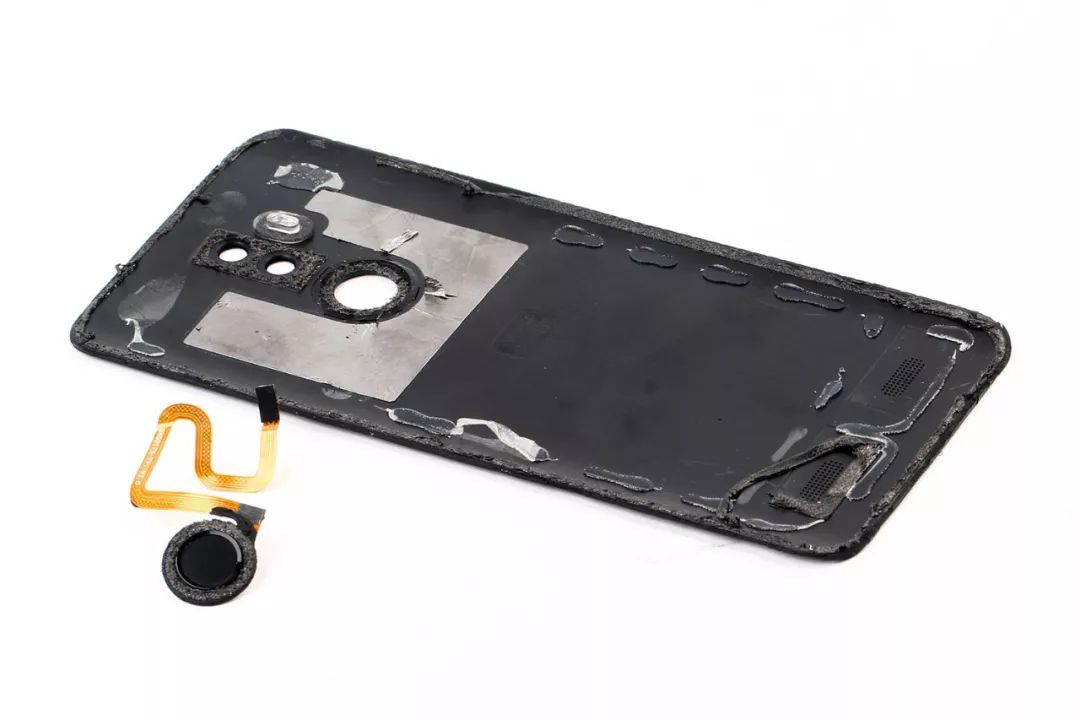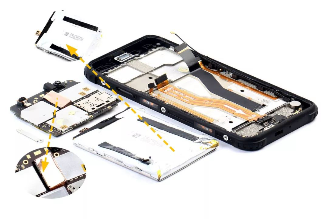 为了达致更好的抗冲击效果,AGMX3采用了PC+ABS作为后盖的主要材质。后盖用防水泡棉胶与机身固定,加热手机边缘并取下后盖后可以发现后盖的上半部分贴着一层石墨片帮助散热。
