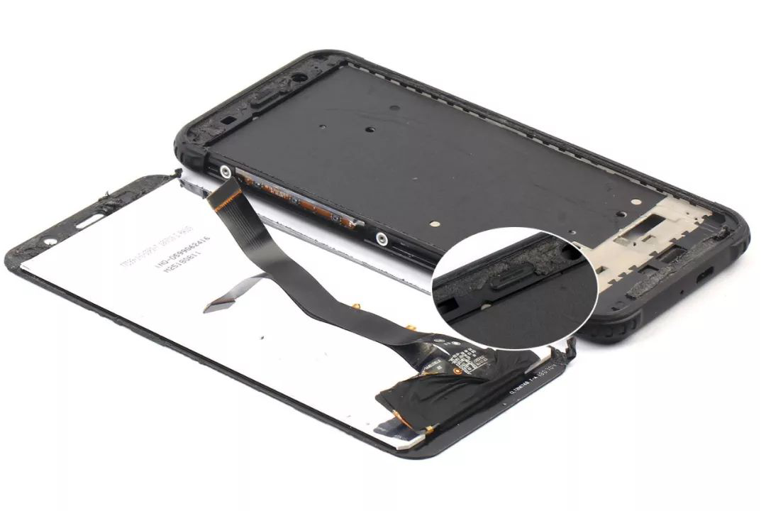 手机内部的部件基本拆卸完成,接下来就轮到屏幕部分。AGMX3采用的是一块6.0英寸的IPS屏幕,屏幕与中框之间采用防水泡棉胶进行粘合固定,取下屏幕后可以看到中框上贴有一大块石墨贴片帮助散热。中框上手机的四角设有防摔气囊结构。