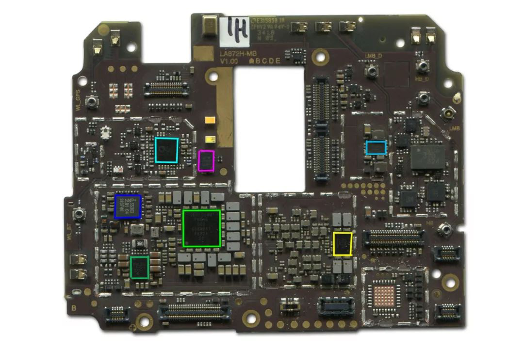 前后摄像头模块以及光线传感器都与主板直接相连,前后摄像头模组背面都贴有散热铜箔,光线传感器为独立模块,模块背面有一块塑胶物料作为缓冲,整个模块用双面胶固定在主板正面左上侧。