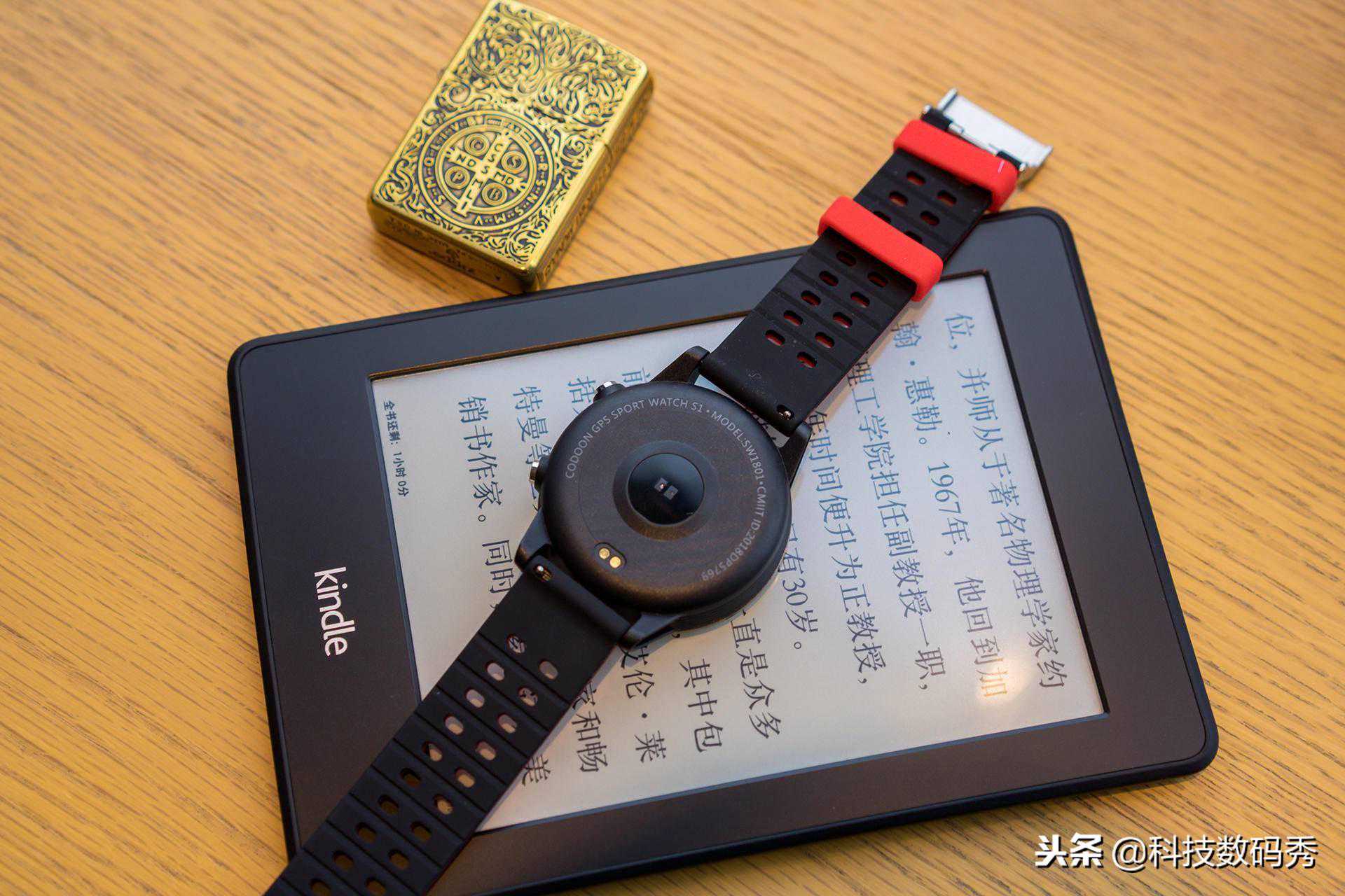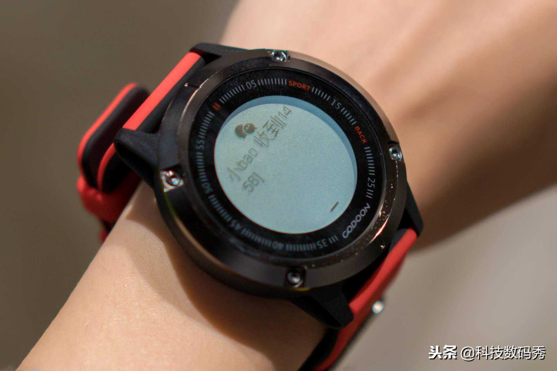 首先,咕咚手表S1采用了一块1.04英寸的黑白TFT常显屏,可视范围远超手环,也并不次于其它品牌的智能手表,正面黑色机身,金属钢圈颇具质感,腕带红色很是显眼。
