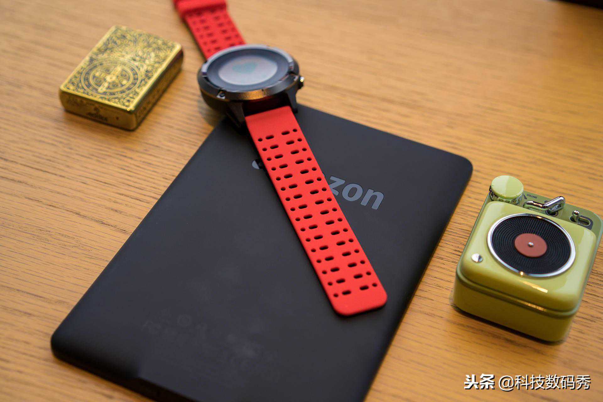 整体黑红色的风格还是蛮漂亮的,医疗级的亲肤橡胶表带,独特的排汗槽结构设计,即使运动量再大,也不会让表带浸在汗水之中。