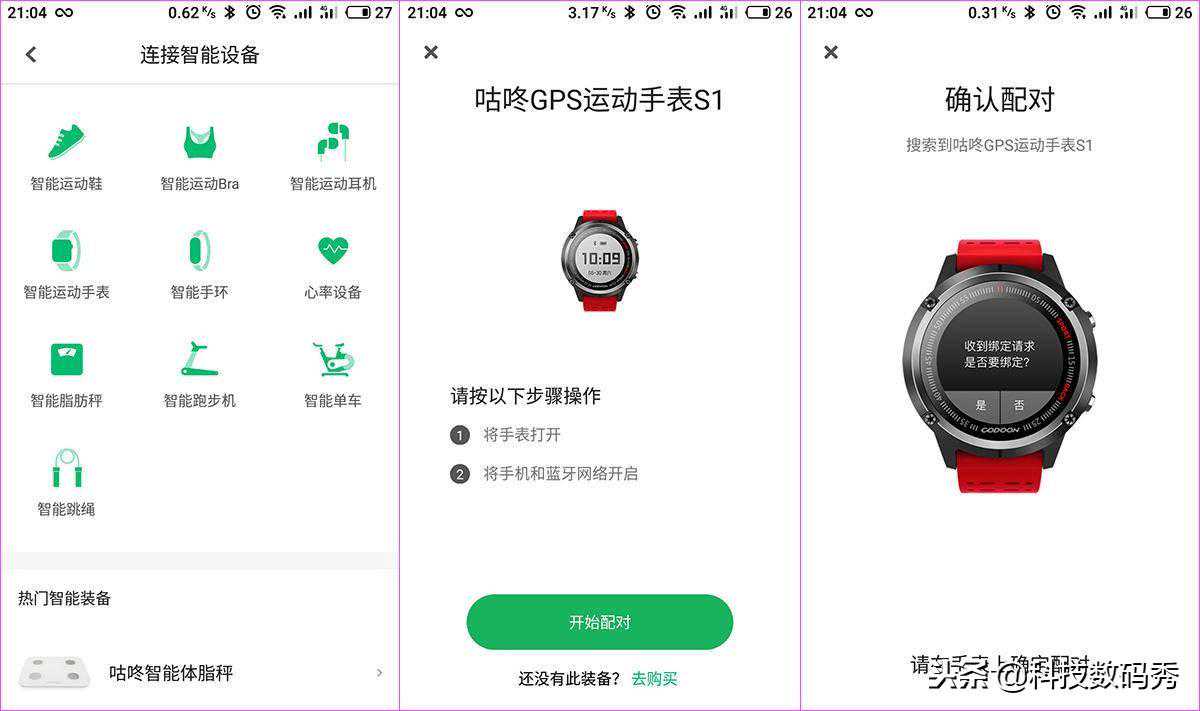 咕咚客户端还是非常强大的,强大到各种智能运动产品,比如智能运动鞋、Bra(确定没看错?厉害了我的咕咚)、手表、手环、脂肪秤、跑步机、单车等等,选择智能手表进入后就可以发现我们的咕咚GPS运动手表S1,通过在手表上配合进行连接。