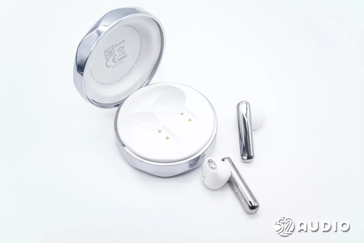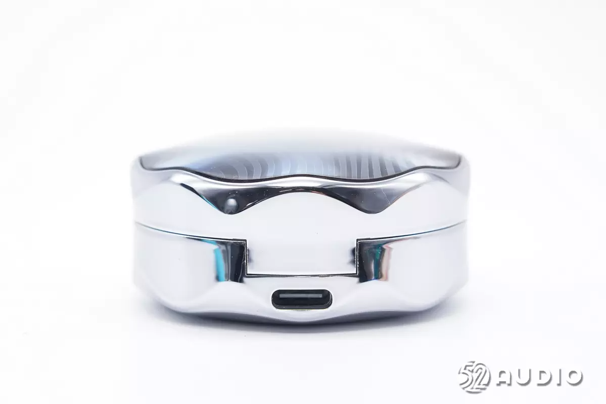 充电盒底部外观一览,机身采用了NCVM真空镀膜工艺,触感顺滑细腻。底座设计有三颗凸点,防止机身磨损。