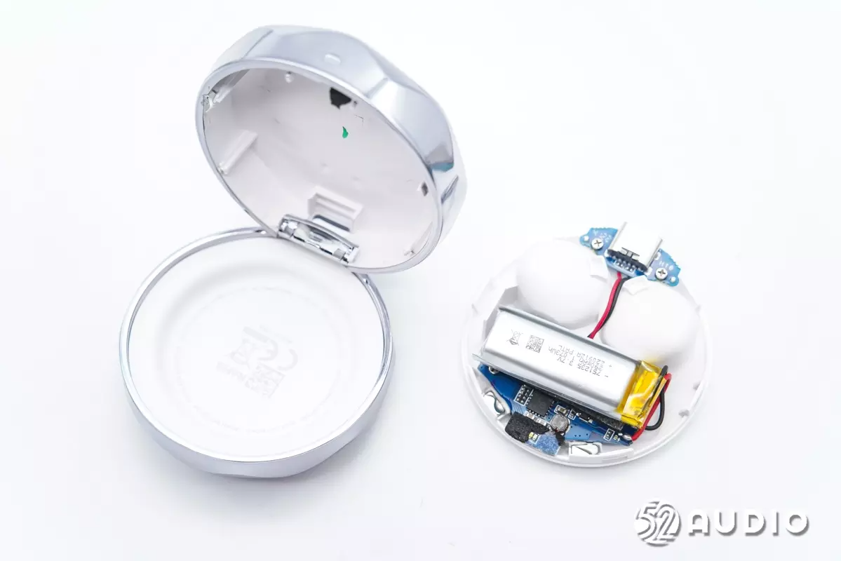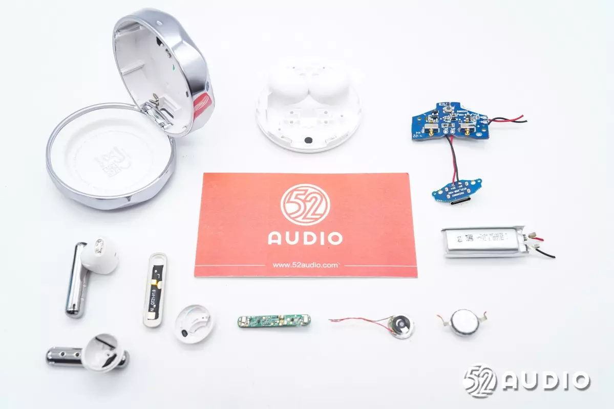 耳机内部搭载了10mm动圈单元,复合镀钛振膜搭配低音导管结构,拥有不俗的中高频解析力和低频震撼力。耳机主控芯片采用了杰理AD6973D蓝牙音频SoC,支持新一代蓝牙5.3,支持回声消除和单/双麦克风降噪,搭配两颗瑞勤电子MEMS麦克风,为耳机提供稳定无线音频和清晰通话效果。耳机内置35mAh软包扣试电池,同样采用了创芯微锂电保护IC负责充放电保护,型号为CM1124-EBC。