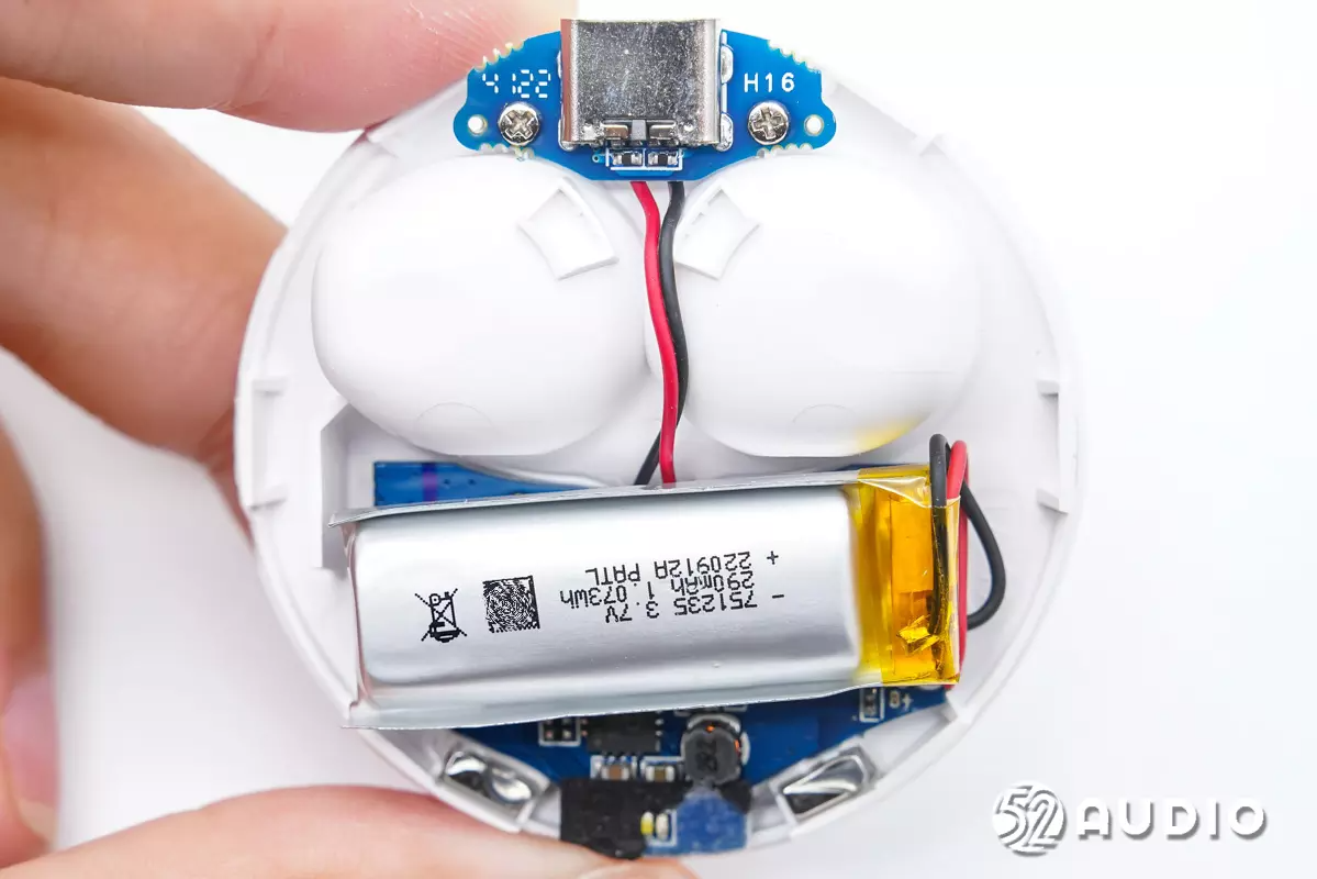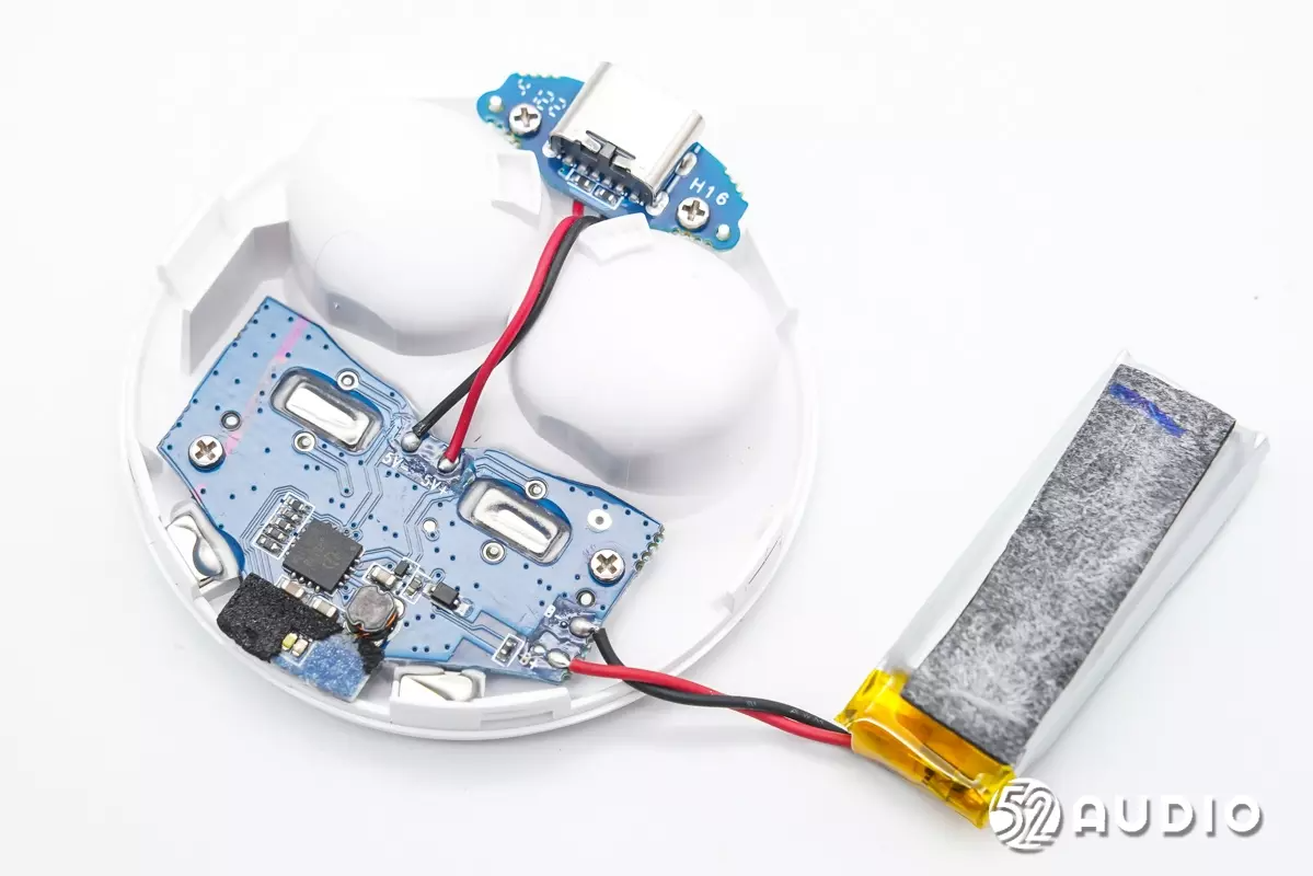 充电盒座舱底部底部结构一览,PCB板通过螺丝固定,电池固定在主板上。
