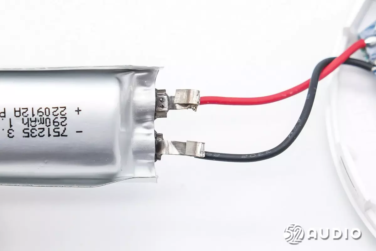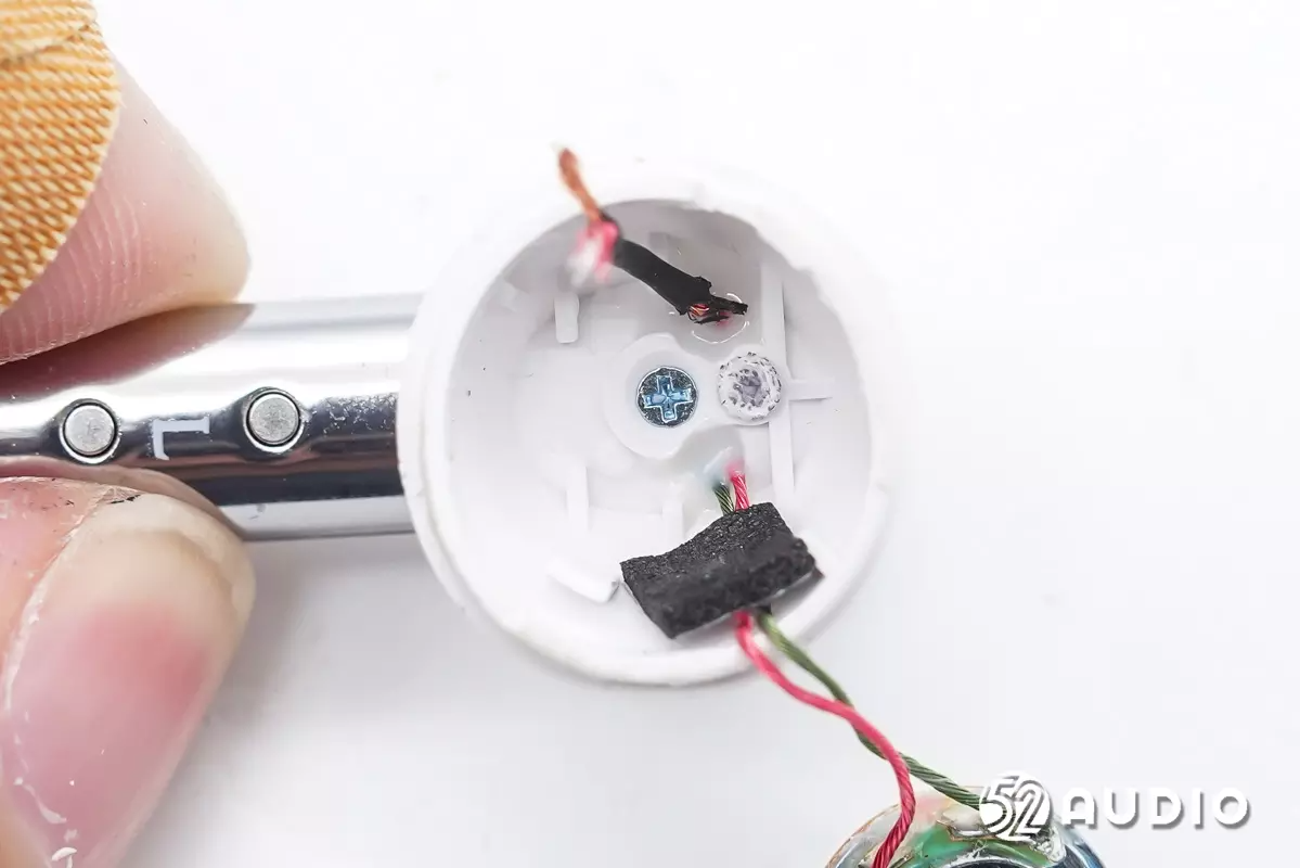 后腔内部结构一览,固定电池单元,与扬声器分别通过导线连接到耳机柄内部主板。
