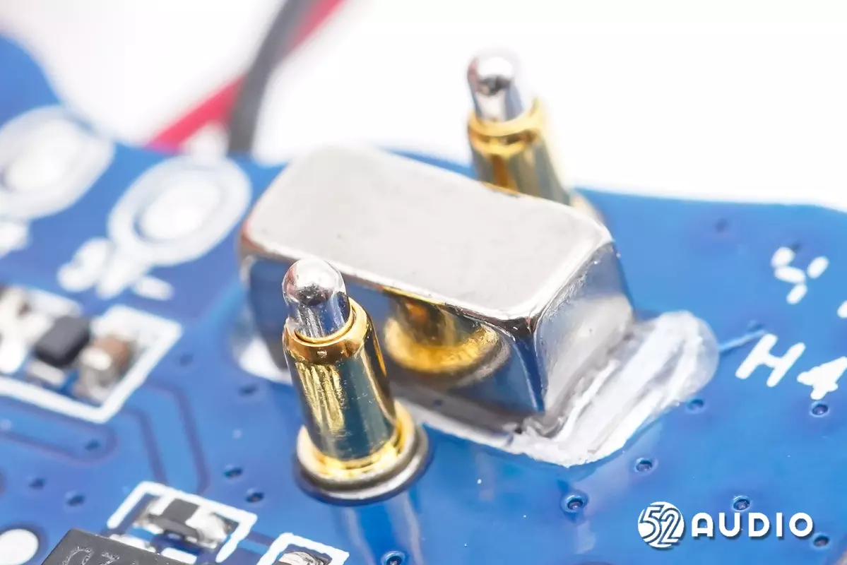 主板上为耳机充电的PogoPin连接器特写,中间固定磁铁,用于吸附耳机。