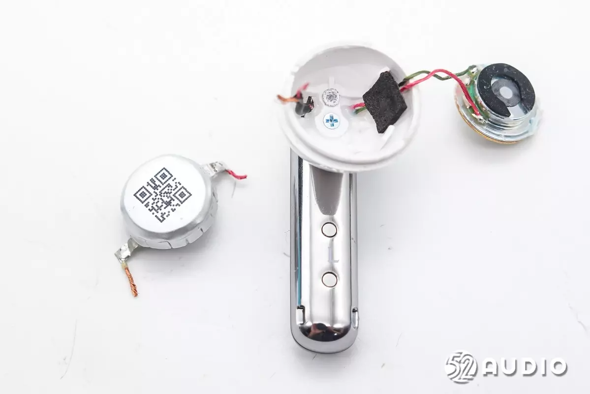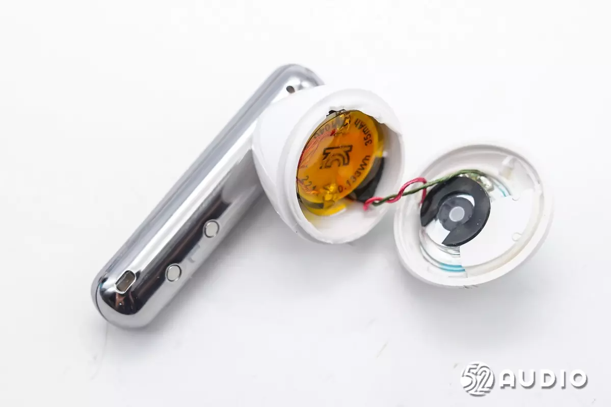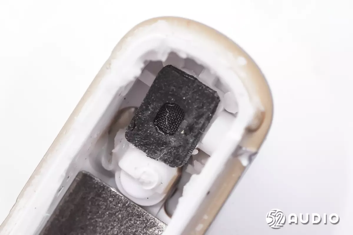 耳机前腔内部结构一览,扬声器上方设计有低音导管,提升低频量感。