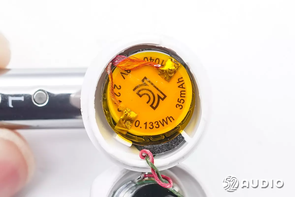 耳机内部采用了软包扣式电池,标签上信息有型号:1040,电压:3.8V,容量:35mAh/0.133Wh。