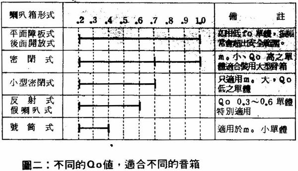 知道了单体的Qo值后,可以参考附表(图二),上面列明了单体Qo值和适合装用喇叭箱的形式,观察该表可以发现,密闭式喇叭箱适合的Qo值范围最大,可为0.2~1.0,而小型密闭式和低音反射式适合的Qo值范围较小,号筒式范围更小。