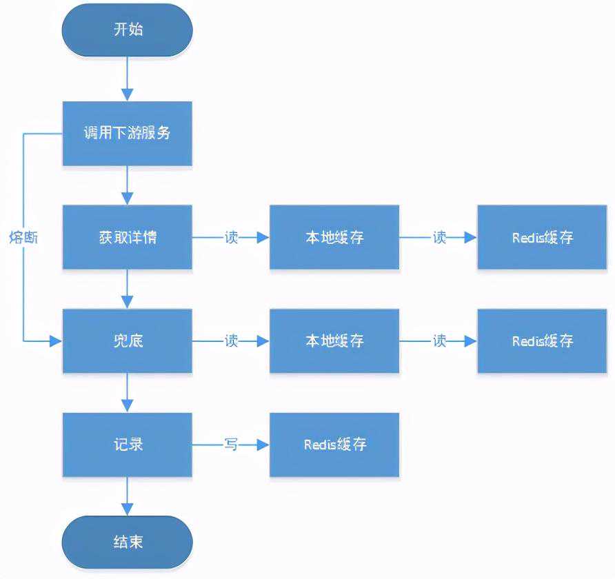 如果第一步调用下游接口异常,则进行数据兜底,兜底流程为先到本地缓存中获取,如果本地缓存没有,则从Redis进行回源,Redis中无则直接返回,异步线程从数据库进行回源。