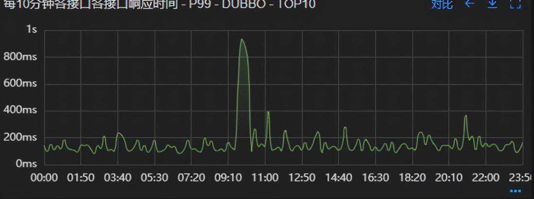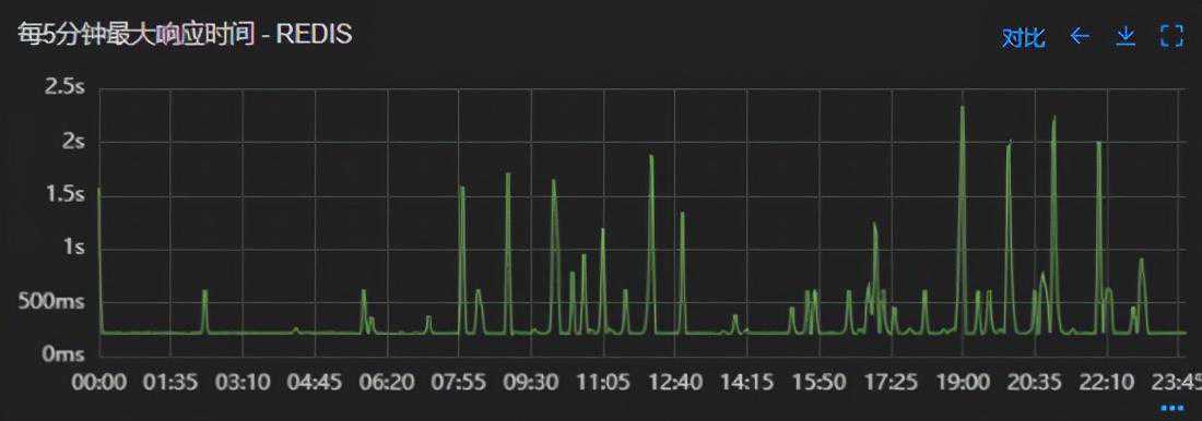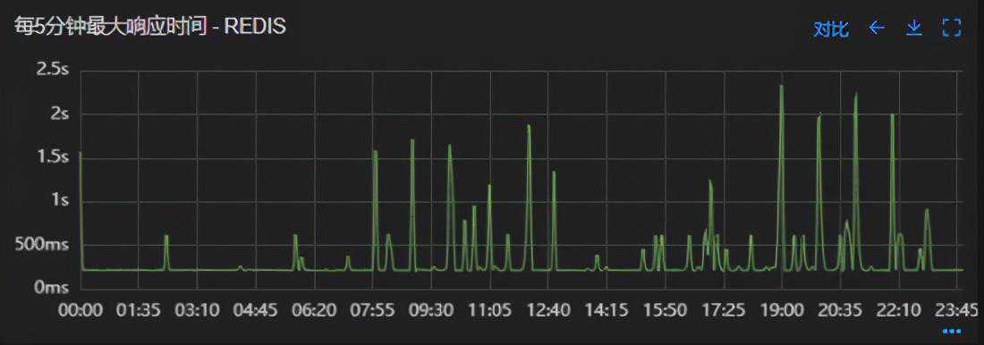 没有从本地缓存读取,而是直接从Redis中获取了数据,Redis最大响应时间也确实发现了不合理的突刺,继续分析发现Redis响应时间和Dubbo99线突刺情况基本一致,感觉此时已经找到了问题的原因,心中暗喜。