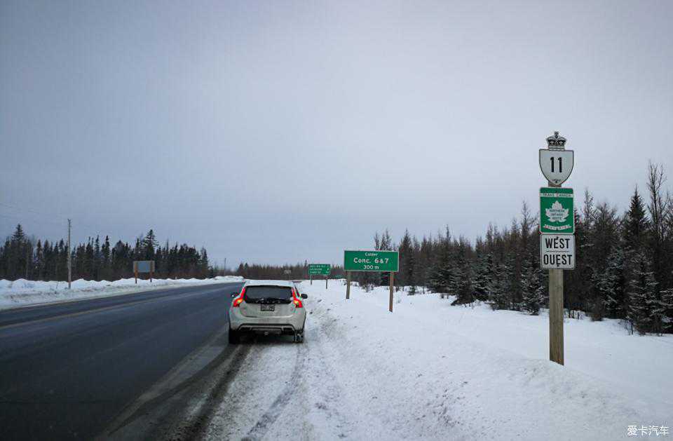 从蒙特利尔出发,一个小时进入安大略省,再经过加拿大首都渥太华及安省中部城市北湾NorthBay。从这个十字路口直行驶上11号高速(左转就是上次走的17号高速),再继续行驶约400公里就到达了今天的目的地蒂明斯Timmins。
