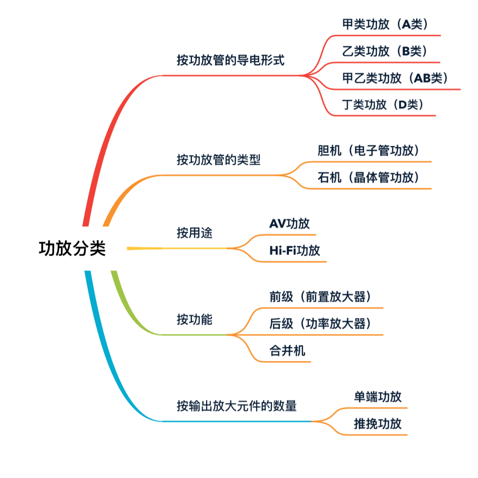 2、功放的分类对于功放的分类是很容易让人迷糊的,主要原因就是功放的分类标准太多,分类出来的功放又相互穿插,我在刚刚接触的时候总是搞混。今天我整理了一张图来对功放进行分类,希望能帮大家理清。