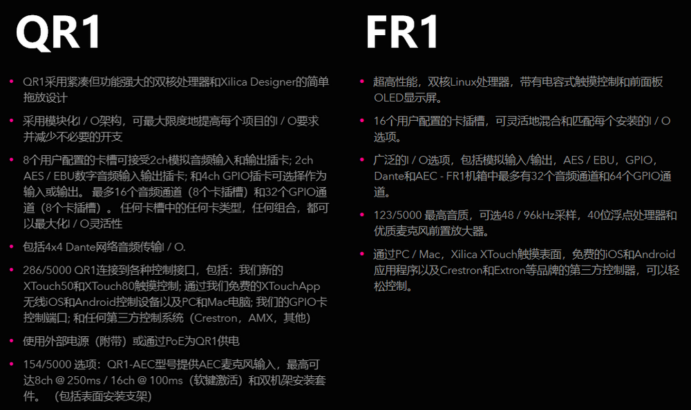 SOLAROQR11/4模块化DSP作为Xilica新Solaro系列处理器的一员,QR1完全是模块化I/O灵活性和强大的双核处理,内置于紧凑的机箱中。SolaroQR1(四分之一机架)DSP体积虽小但功能同样强大。QR1是紧凑的,但同样的Linux平台和双核处理器驱动这个模块化拖放配置的网络处理器和模块化I/O架构使QR1高度用户可配置。8个模块化卡槽可接受2ch音频输入和输出卡以及4chGPIO卡,可选择作为输入或输出。任何卡槽中的任何卡片类型,任何组合,最大化I/O灵活性。