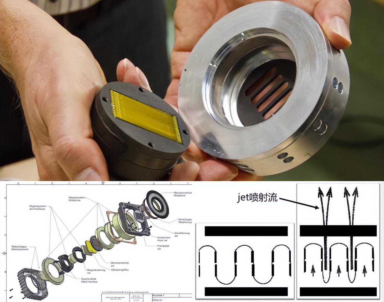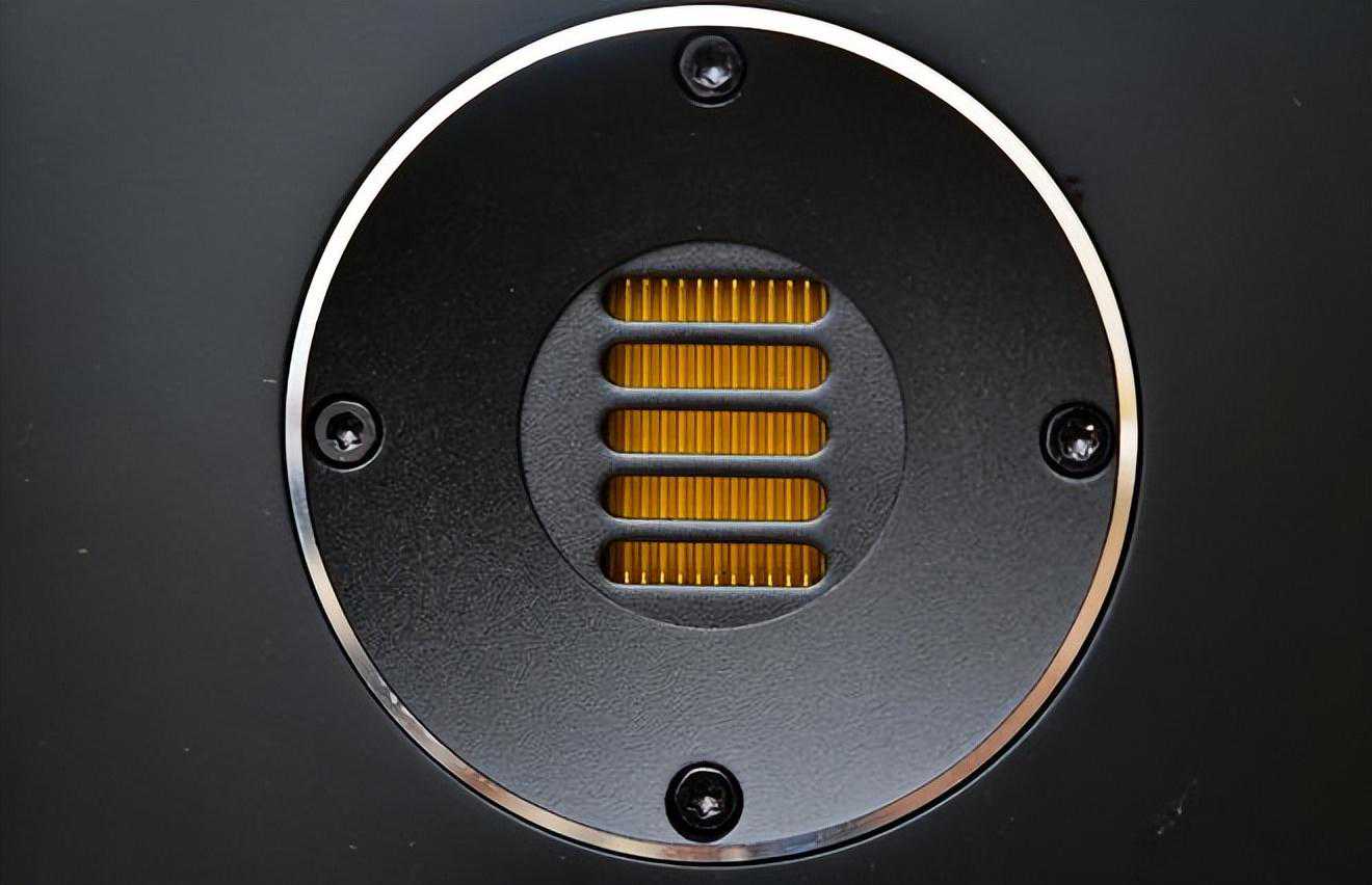 下图是JET气动单元的特写。JET是JetEmitterTweeter的缩写,属于ELAC的专利高音技术,其发声原理是通过将一张超薄铝质振膜反复对折成像手风琴一样凹凸表面,然后通过电流控制磁场挤压褶皱,将褶皱中间的气流喷射出去,从而产生高频声波。
