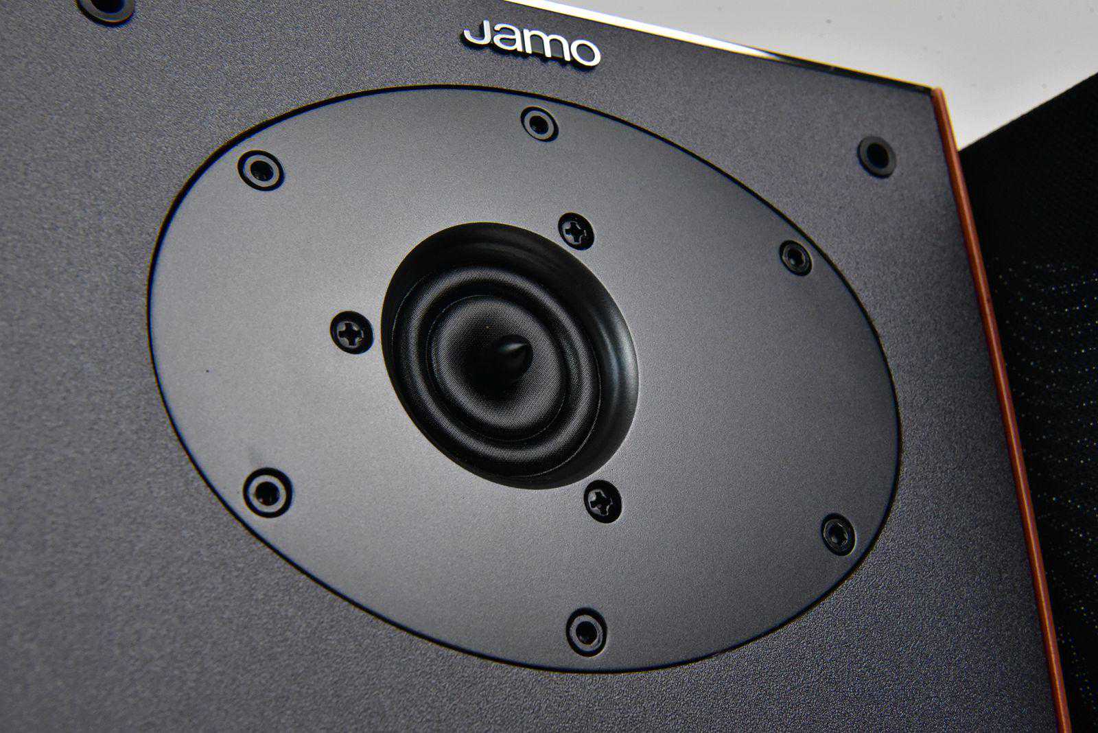 ▲7英寸的低音单元展示,木质纤维锥盆质感可见,是Jamo尊宝品牌的标志形象。加上铝制相位塞,D430II的最高输入功率可达200W。