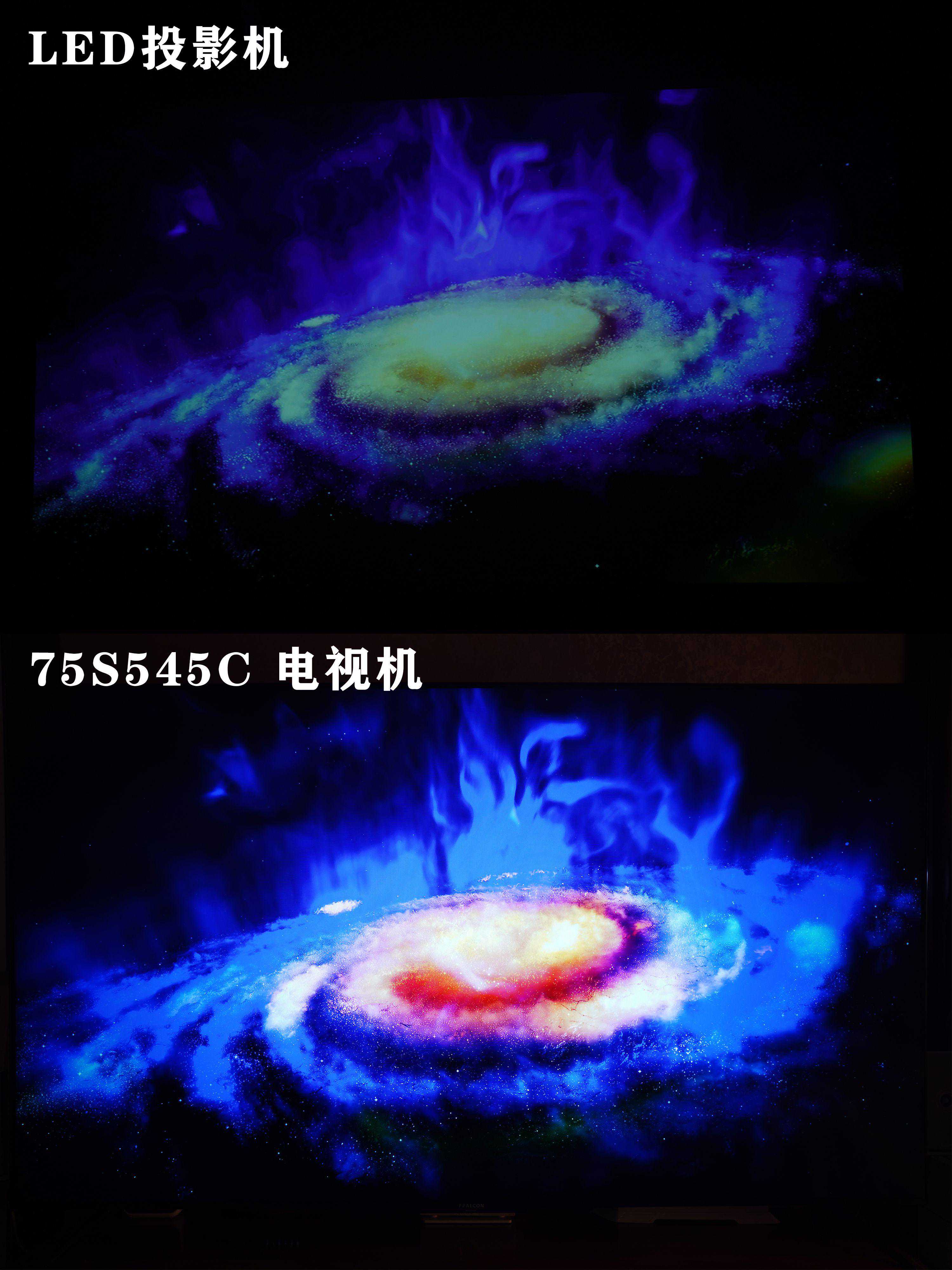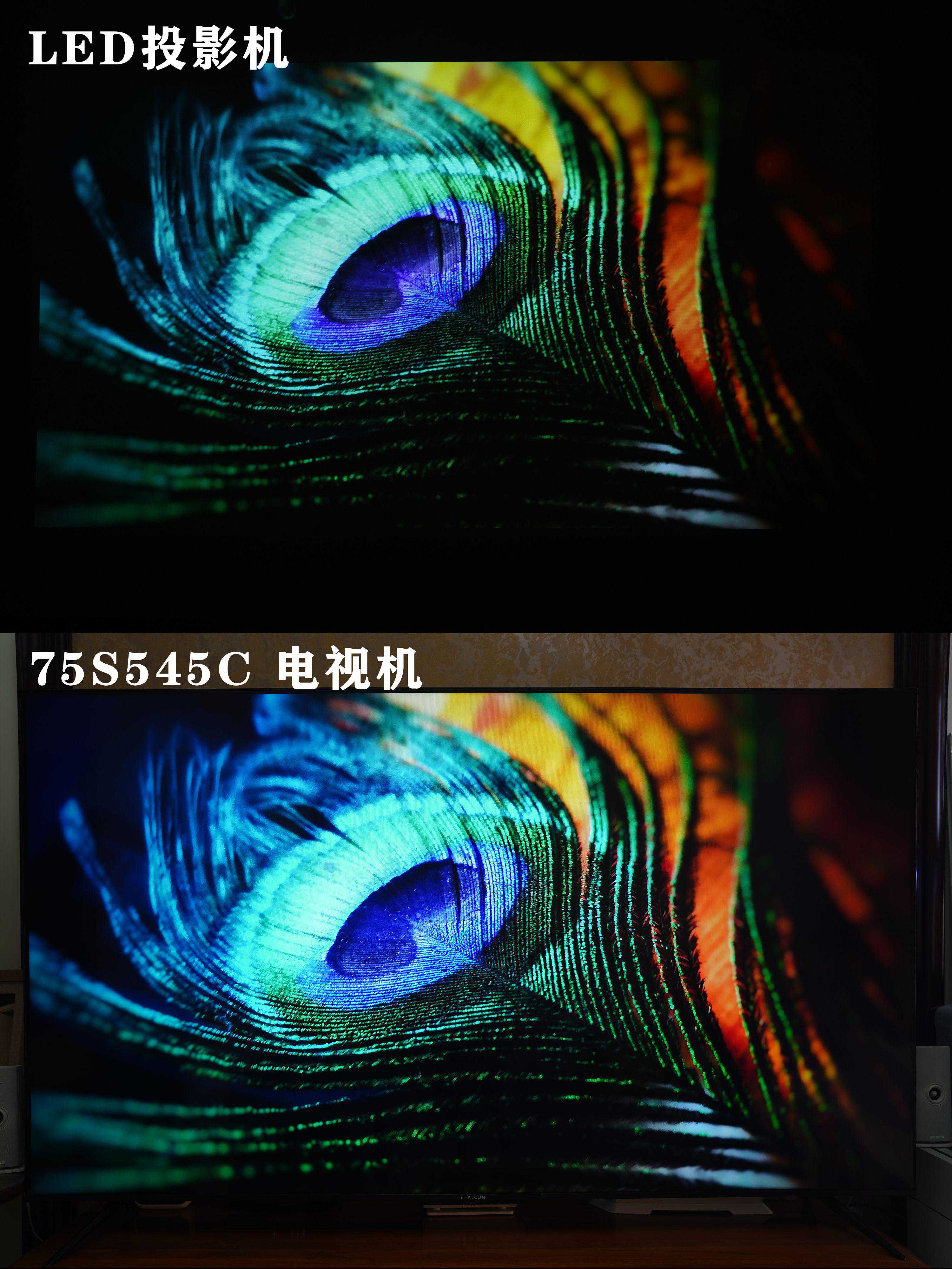 ▼这里我也把投影机搬出来做了个对比,考虑到亮度的问题,把投影机放的更近一点也投射大约75寸的画面,当然我用的是LED投影(买的时候也花了近6000元),如果用灯泡效果会好一些,但是整体和电视的画质还是有比较大的差距的。