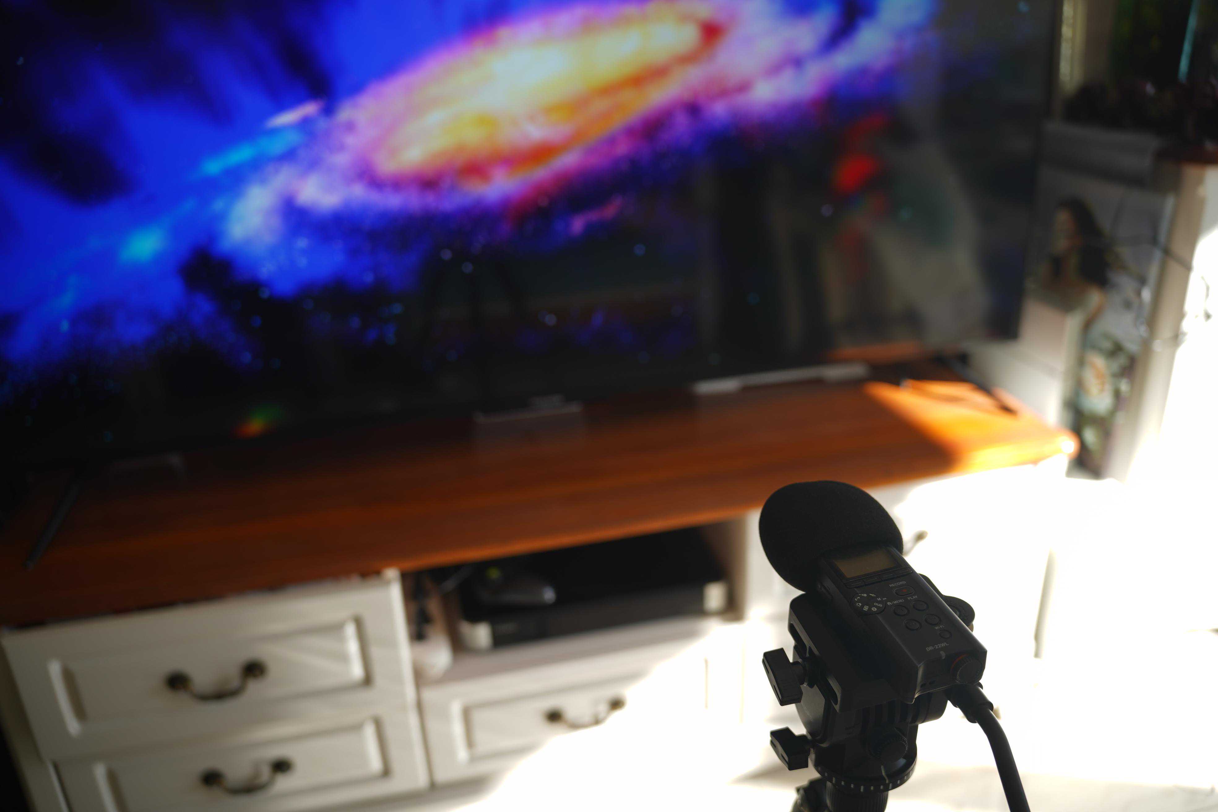 ▼如果你确实不需要这么复杂的音响设备,或者担心会吵到邻居,那么利用这台电视本身的两只15W音箱其实也能满足普通用户的需求,本身电视也通过了杜比全景声的认证,再加上系统中音效增强的功能,我试听了一下,个人觉得比起不带独立低音的回音壁要更好,这里我也用专业的录音笔在1.5米左右的位置录制了播放的情况,有兴趣的朋友可以下载下来,带上耳机试听一下。