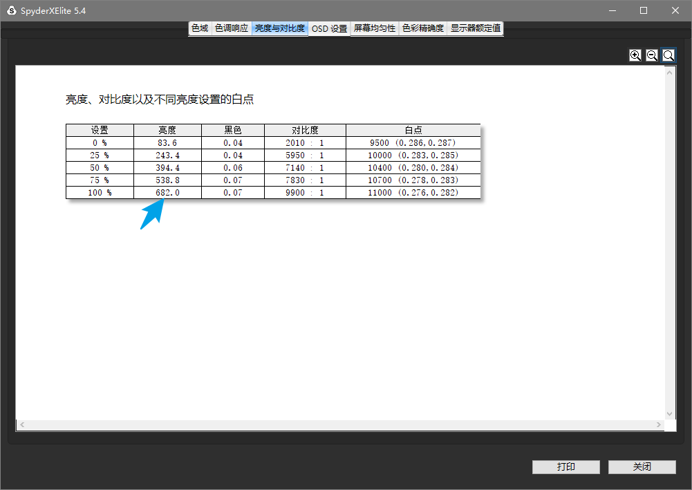 ▼校色仪主要是用于显示器的,在测试电视时由于画面调校、尺寸等原因会有一些误差,我之前测试400nit亮度的电视时,显示的数据约在350nit左右,而这台电视的实测最高亮度为682nit,考虑到误差情况和宣传基本相符。