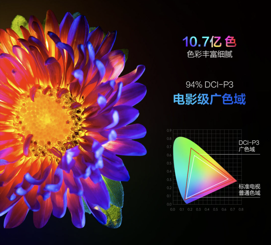 ▼同样对HDR影响较大的因素还有色域,色域越广,能显示出的色彩就越多,颜色过渡更平滑,显示的内容也更丰富。色域有多个标准,不过在影视行业中应用最广泛的是由美国电影行业推出的一种广色域标准——DCI-P3,也是目前数字电影回放设备的色彩标准之一。这台电视覆盖了94%的DCI-P3色域,能更真实地呈现电影中所要呈现的所有色彩。