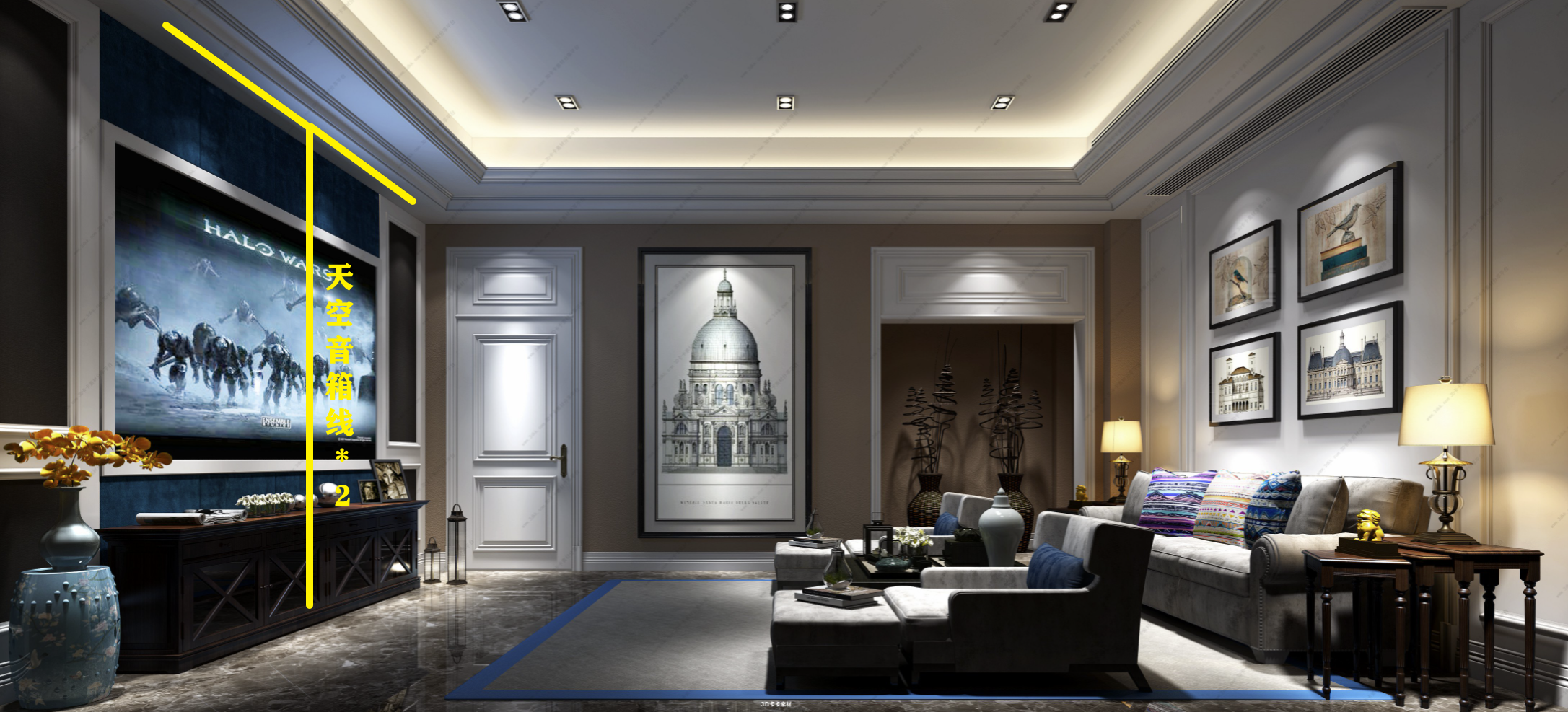 ▼如果想要5.1.2声道,还要增加两条音箱线到正面吊顶上方的位置。