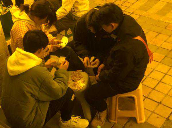 在拐弯处,几个年轻人拿凳子当桌子,凑在一起打扑克。他们在天水上学,因为现在没课,就结伴来排队吃麻辣烫。问及既然是当地的,为何不等风头过去,不需要排这么久的时候再来,一个女孩不假思索地说:“就是趁热闹才有意思嘛。”