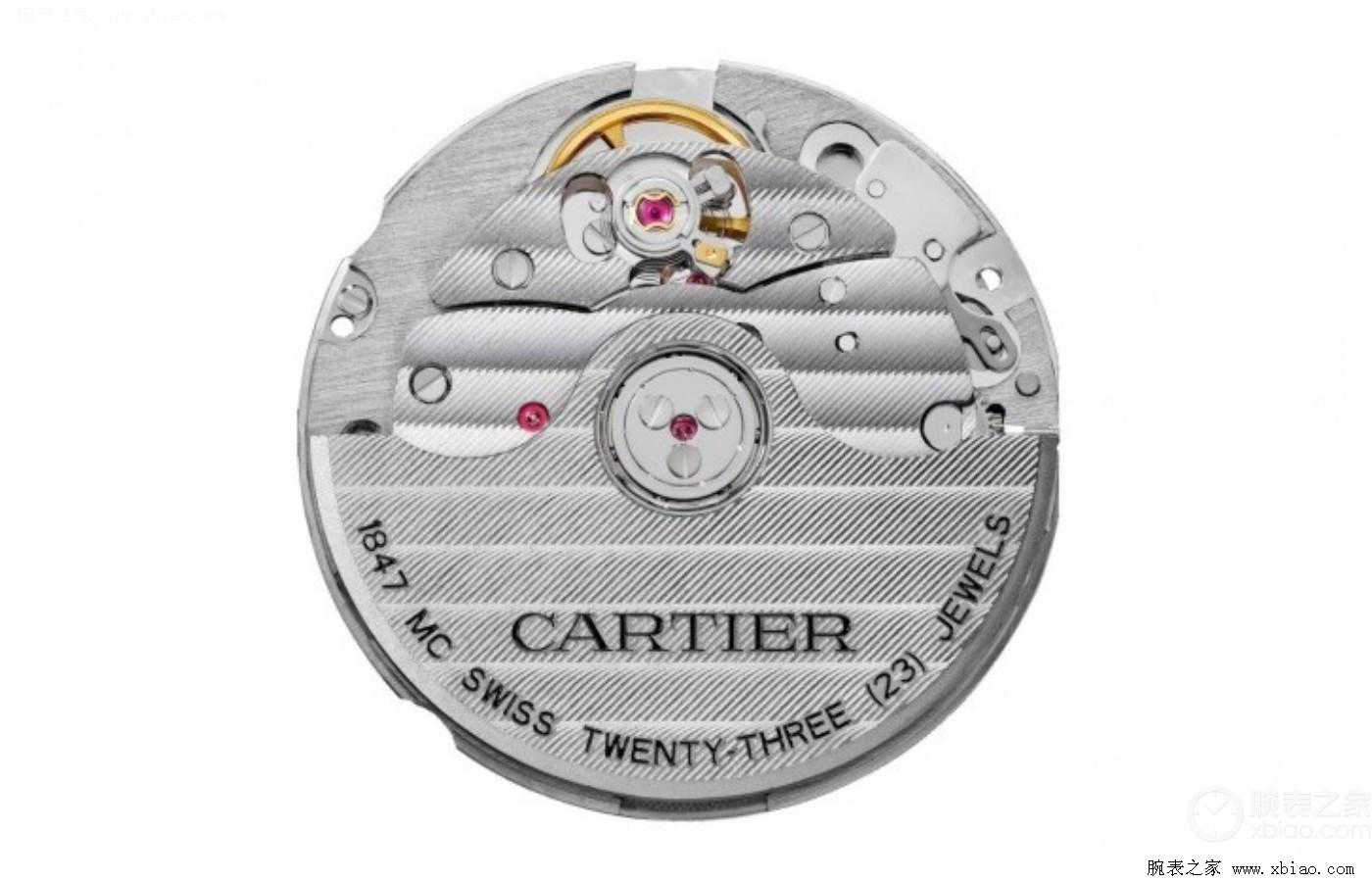 了解完这几枚集团化的高端机芯后,我们再把目光转投到销量更大的中端阵营。以时间为序,最先登场的还是卡地亚。1847MC机芯于2015年推出,其直径为26.2毫米。与1904-PSMC的双发条盒方案不同,它仅为单一发条盒,但动力储存仍维持在42小时。机芯采用横跨式摆轮表桥、Incabloc避震器。