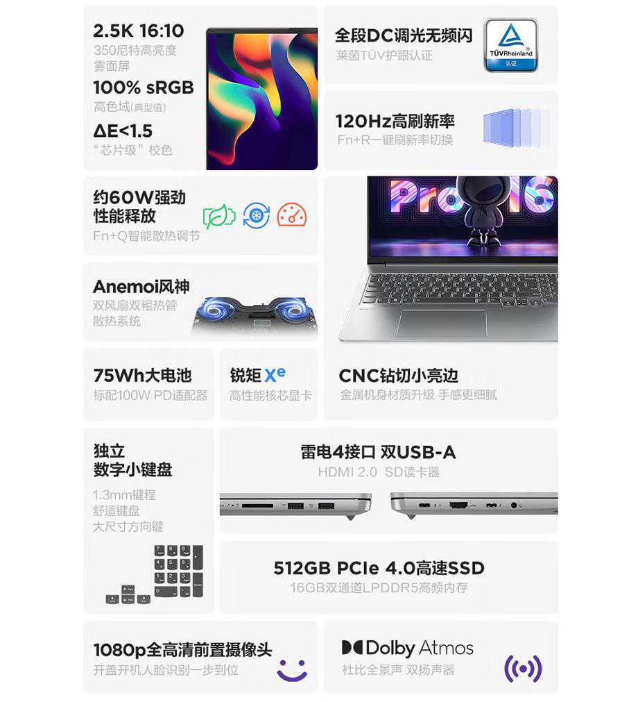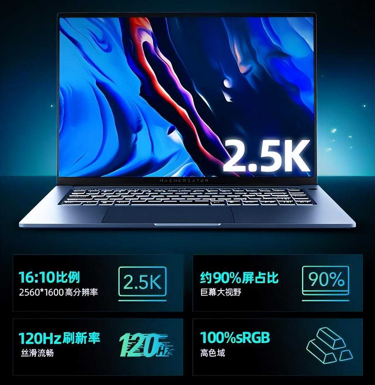 屏幕为16英寸,2.5K屏,2560x1600分辨率,120Hz高刷,100%sRGB色域。键盘带有背光,没有小键盘区域,更为宽敞。