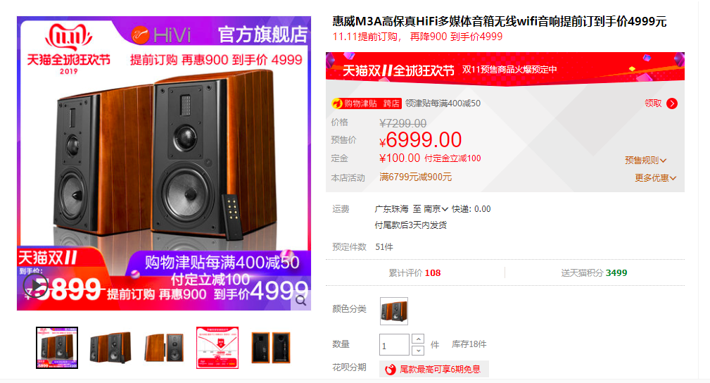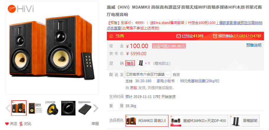 惠威M3A音箱原价6999元,双“十一”期间天猫平台到手价仅需4999元,喜欢的朋友赶紧加购预约吧!