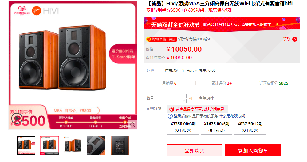 惠威M5A音箱原价8800元,双“十一”期间京东和天猫平台到手价仅需8500元,喜欢的朋友赶紧加购预约吧!