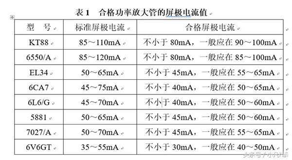 购买电子管,尤其在购买二手旧管时,常为如何判定其优劣而烦心,我们可根据它们屏极电流的测量值,与标准值比对,大致作出判定。一个电子管不能光凭测量互导值判别其优劣,但量度屏极电流则有较大参考价值,互导合格并不能表征该管的新旧程度,旧管的屏极电流则会较小。下表列出一些功率管的屏极电流合格值,供参考: