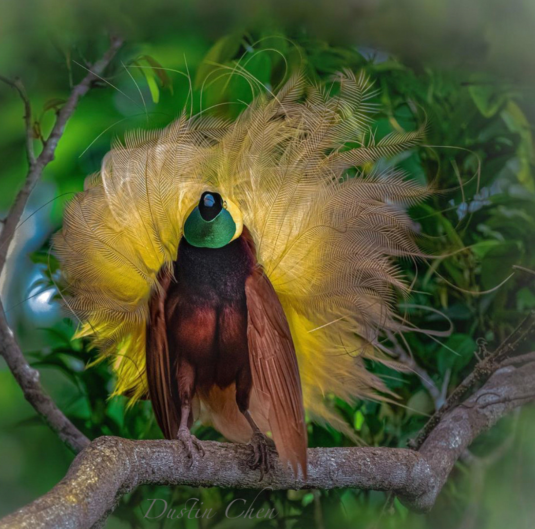 在阅读了很多有关天堂鸟书籍之后,无意中看到阿鲁岛的当地人还在用华乐士时代的方式捕鸟技能和经验,但是现在他们把这种技能和经验转移到帮助拍鸟人近距离拍摄大天堂鸟的生态旅游体验服务里。出于极大的好奇心,我在2019年8月份去了阿鲁岛,被调到25米树顶,当地人用传统方式建造的隐帐里,距离大天堂鸟跳舞的直线距离在10米之内,拍摄于了一组大天堂鸟跳求偶舞的一系列照片,这张照片,大天堂鸟正对我的镜头,处于极度兴奋的状态,把它的繁殖羽,最强最美的姿态完全展现出来,当然它的舞姿并不是为了在镜头前展现,而是希望把自己的优良基因通过舞姿展现出来吸引母鸟,获得交配权,繁衍下一代。