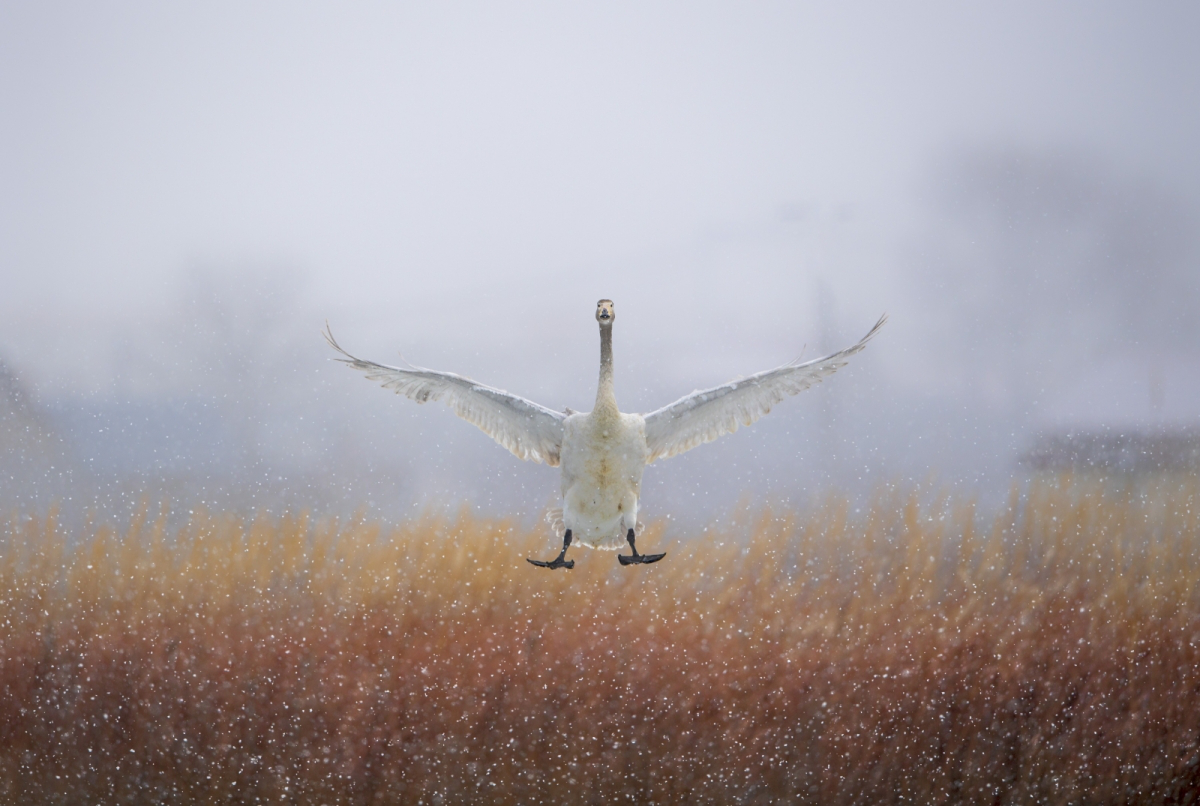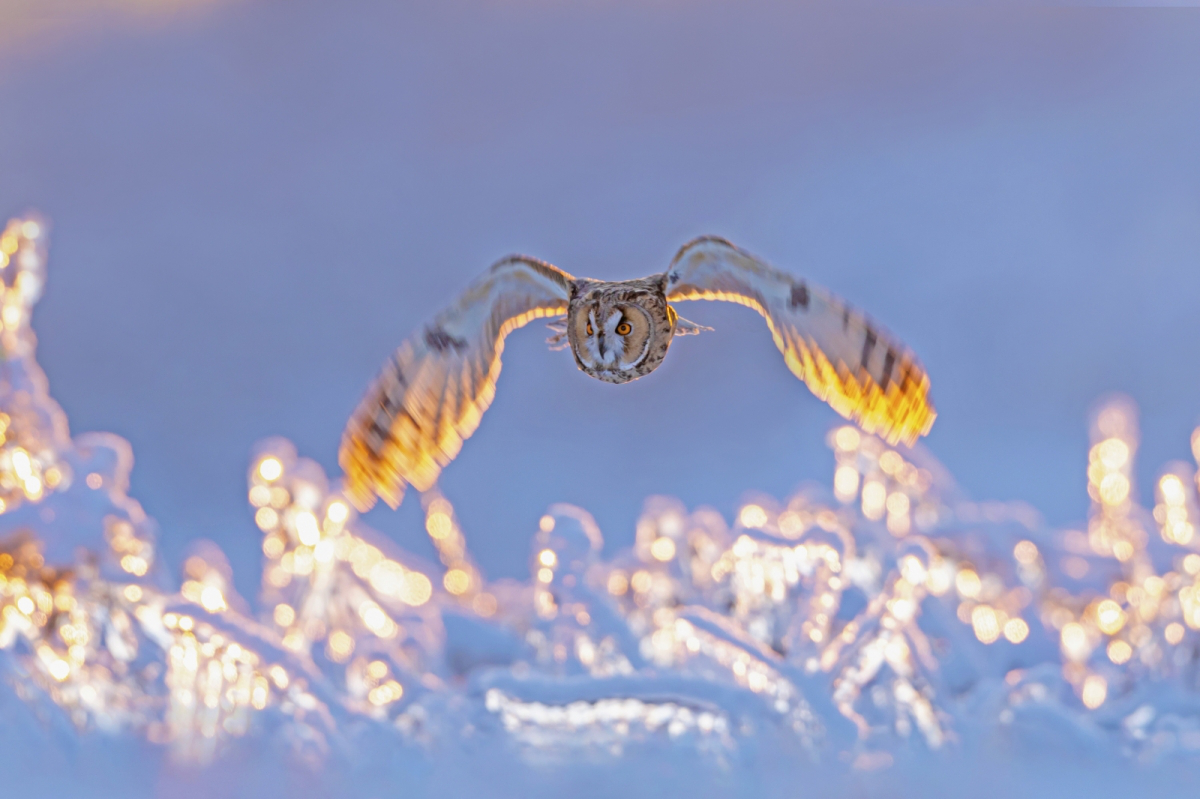 图片描述:在一个下雪的早晨,我开车来到湿地寻找心中鸟,开车转悠很久,心中的它一直没有出现,雪一直下,天越来越冷,正当我停车准备收拾设备回家的时候,抬头看见前方不远处有一堆草丛,我习惯性拿出望远镜看过去,立刻我就热血沸腾了,终于看见心中的它正静静地趴在草丛里,身上大部分被大雪覆盖着,其他部位又和草丛十分靠色,雕鸮与生俱来的保护色大大增强了它的安全系数。只要它不动,一般人还真很难发现它的存在。我怀着忐忑的心情慢慢把车开近一点,逐渐靠近、在我估计的安全距离选好角度停车打开窗户,拿出相机激动地按下快门记录它身影。