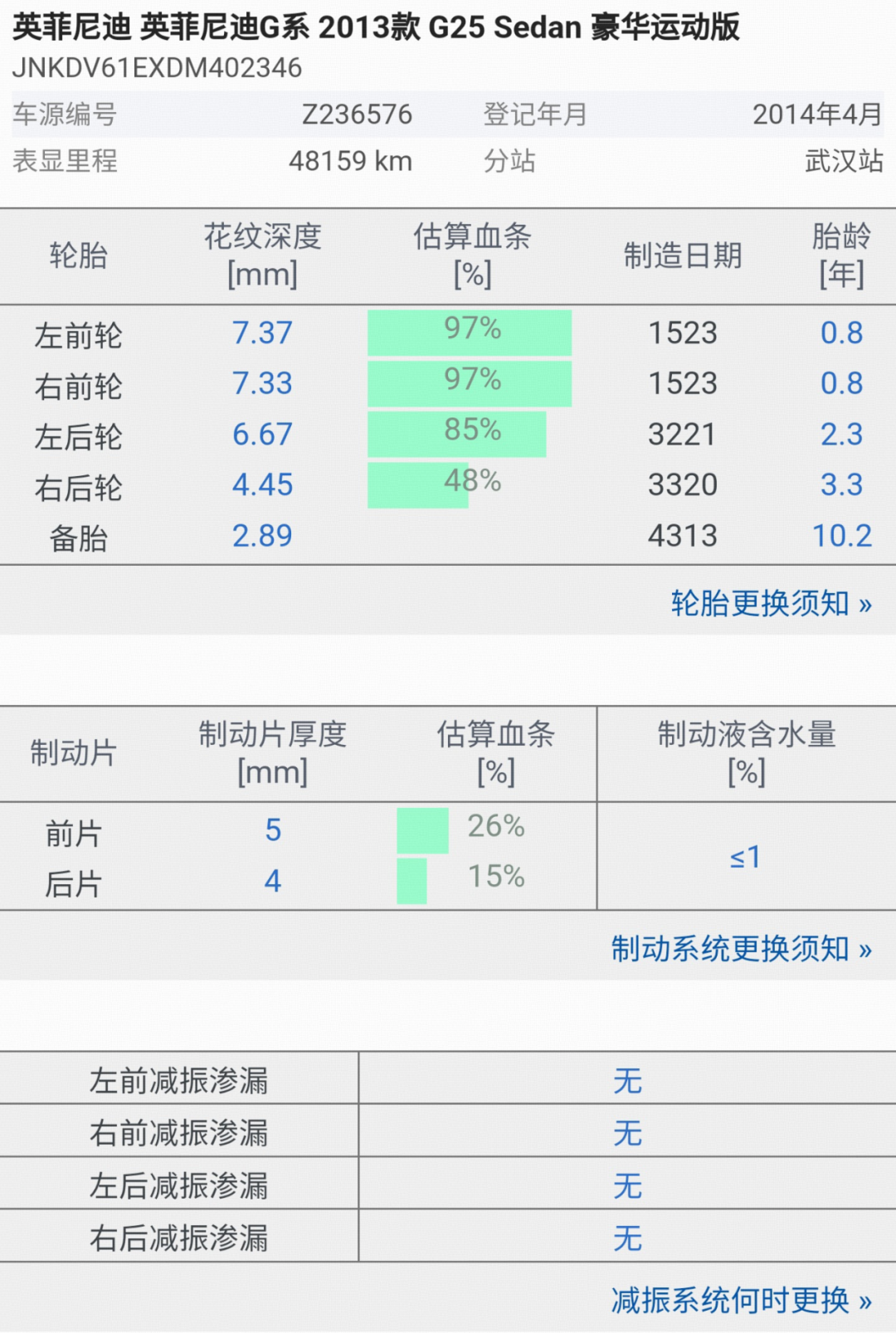 耗材方面就刹车片要留意下,轮胎余量充足,两前胎还是前车主刚换不久的。