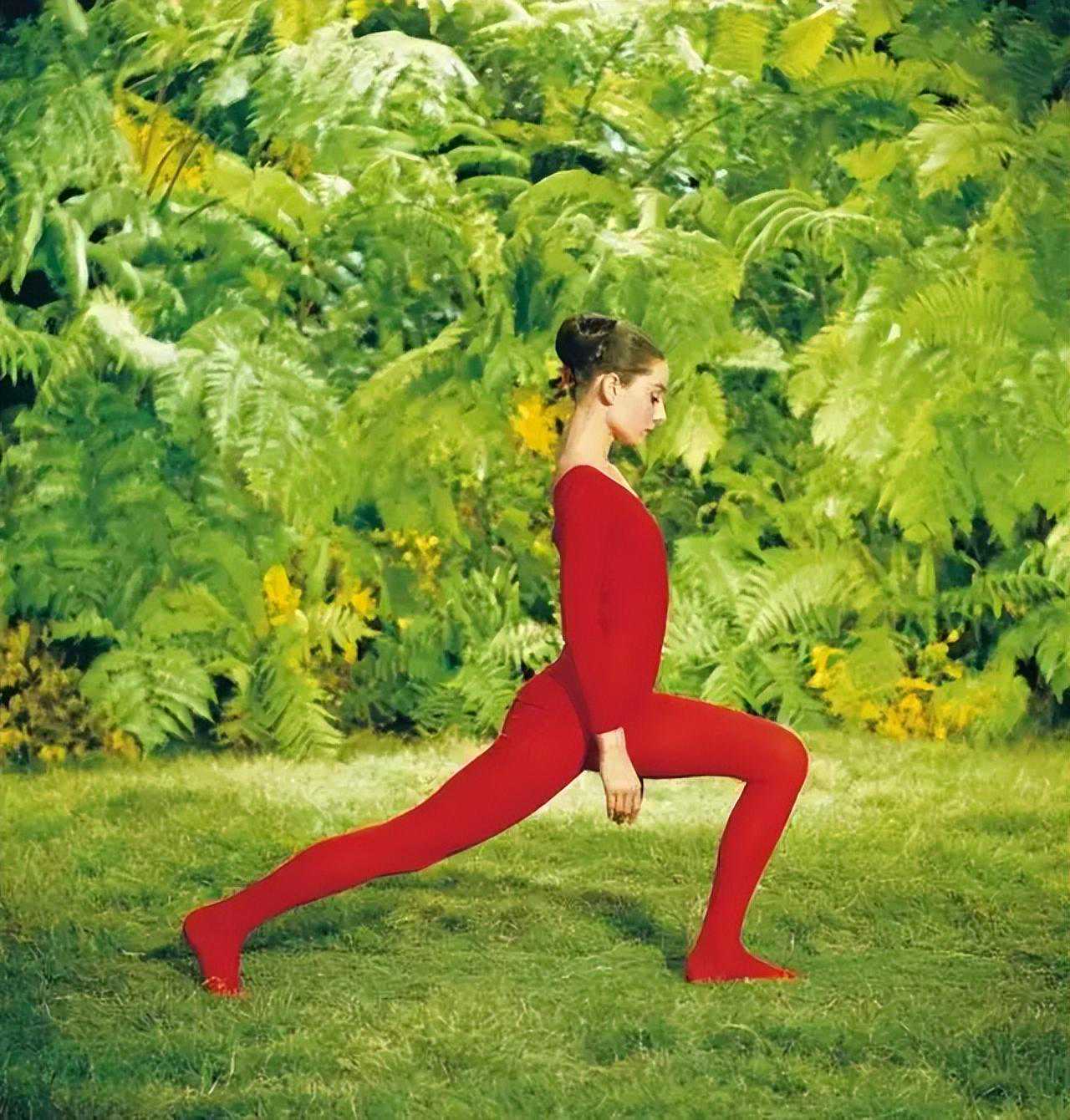Dressedinastrikingredleotard,Audreyexercisesinthegarden.