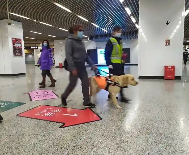 换乘到站后,一位穿着红背心的志愿者主动迎上来,并为其带路。抵达江浦路站后,在工作人员的带领下,赵秋宝和Alpha一同顺利出站。路上有其他乘客不解导盲犬的出现,工作人员也认真解释这是一条工作犬,可以带入地铁站。